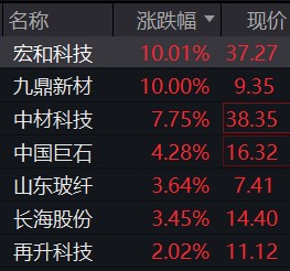 上证报中国证券网讯(记者 于祥明)截至12月23日10点30分,A股玻璃纤维概念持续活跃,宏和科技、九鼎新材双双涨停,中材科技、山东玻纤、长海股份、中国巨石、再升科技等个股跟涨。
